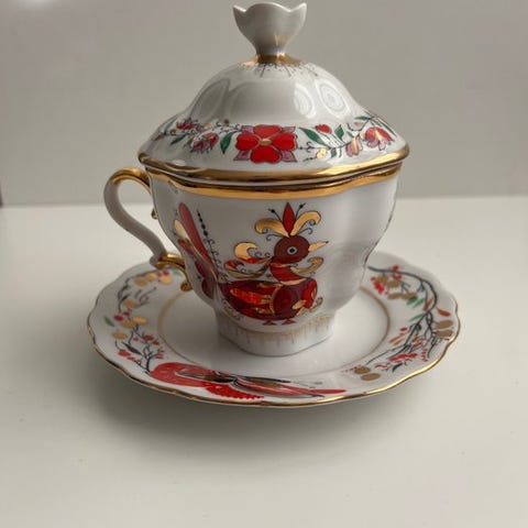 Gå ind i en verden af tidløs elegance med dette sjældne og romantiske 12-delte porcelænskaffesæt – et sandt mesterværk af russisk arv, skabt ved den legendariske St. Petersburg Imperial Porcelain Factory, grundlagt i 1744 af Kejsersinde Elizabeth, datter af Peter den Store.