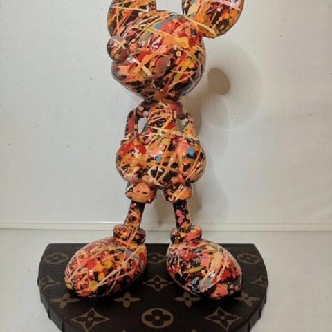 En tom brandslukker, der er blevet malet grøn, med de karakteristiske Gucci-logoer og Mickey-figurstickers, færdiggjort med HQ-lak.