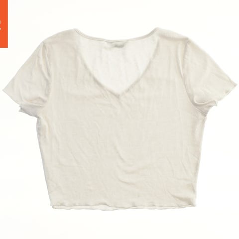 T-shirten er lavet af ribbet materiale og har åbne skuldre. Den er sort og har korte ærmer.