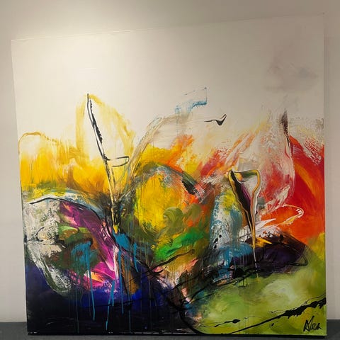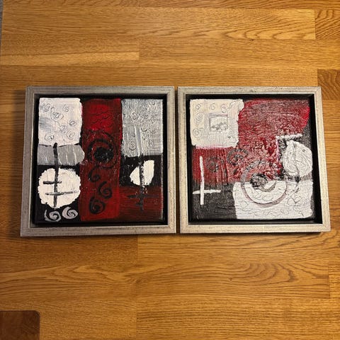 Maleri med abstrakt motiv i sort, hvid og rød farve. Indeholder forskellige former og signaturer. Kan anvendes som vægdekoration. Mål 155x104