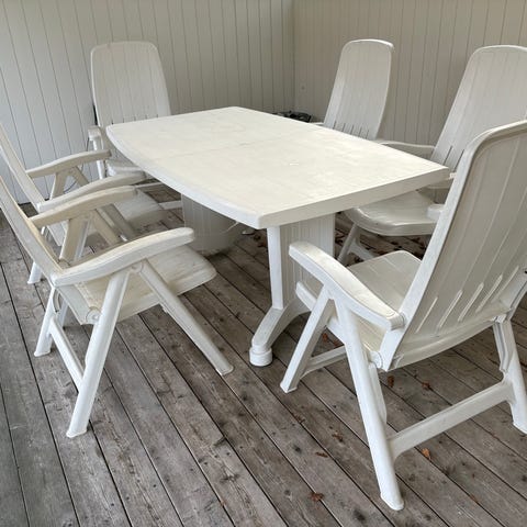 Havebord 90*90 cm. Inkl. 6. Stk havestole og hyndekasse sælges.Hentes i Aarhus V.
