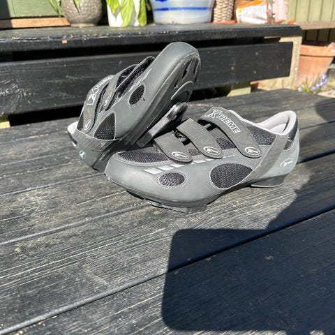 Xtreme Cykelsko i størrelse 45, sort og blå farve. Skoene har klikpedaler og justerbare remme for sikker pasform.