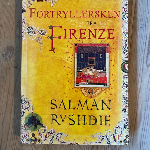 Salman Rushdie Fortryllersken fra Firenze bog med gul cover og illustreret forside. Bogen indeholder en fortælling, der foregår i Firenze.