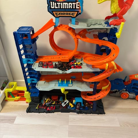 Hot Wheels City Parking Garage med fleretagers bilbane, T-Rex Attack, bilelevator og Plads til +100 biler. Højde: 90 cm. Står som ny.