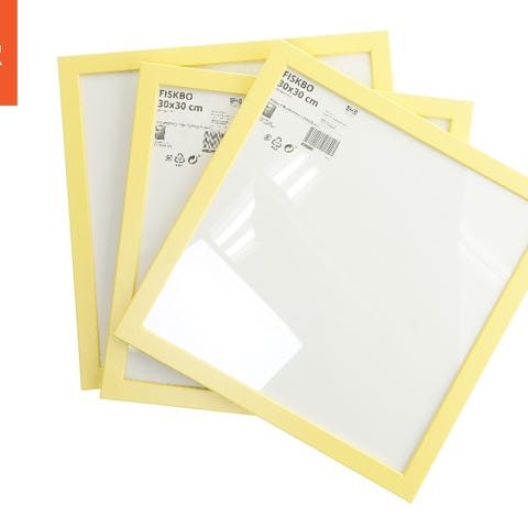 Dette er en samling af billedrammer fra IKEA, pakket i plastik. Samlingen indeholder fem rammer i forskellige størrelser og er ideelle til at præsentere billeder. De er lavet af lyst træ og leveres med ophængningskroge som en del af pakken.
