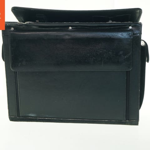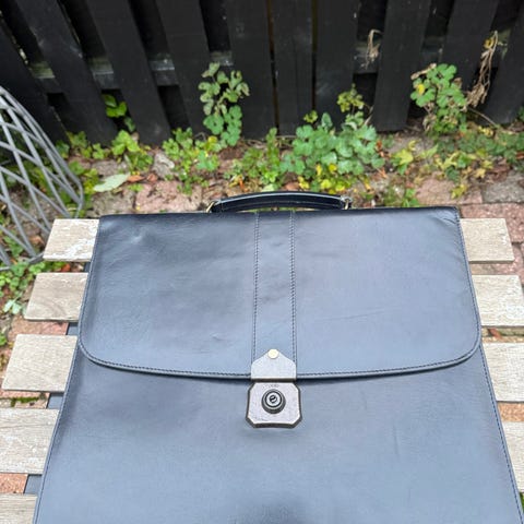 En sort læder dokumentmappe designet til at bære papirer og dokumenter. Mappen har en solid topbærerem og en metalspænde på forsiden for sikker lukning. Bagsiden har en lynlåslomme til yderligere opbevaring. Mappen måler 28x36,5 cm.