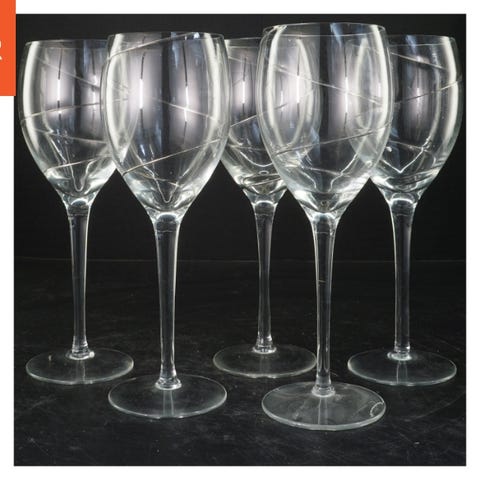 Dette er et sæt bestående af seks vinglas. Glassene har en klassisk design med en let mønstret indgravering på siden og en standard formet stilk med fod. Deres størrelse er cirka 11x4,5 cm, hvilket gør dem velegnede til servering af vin eller andre drikkevarer. Glassene er gennemsigtige og ser ud til at være lavet af klart glas.