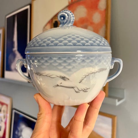 En klassisk porcelæns skål med låg. Den har et blåt design med karakteristiske måger og guld detaljer. Skålen har to håndtag og en rund, buet form. Detaljeret dekoration på lågets håndtag. Perfekt til opbevaring eller servering af madvarer.
