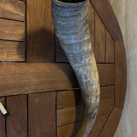 Dette er et dekorativt horn, sandsynligvis lavet af dyrehorn, med en udskåret bund med små huller. Hornet har en naturlig farve, der varierer fra mørkebrun til lysere nuancer. Det kan bruges som et dekorativt element i boligen og har en længde på 20 cm. Tags: horn, dekorativ, indretning