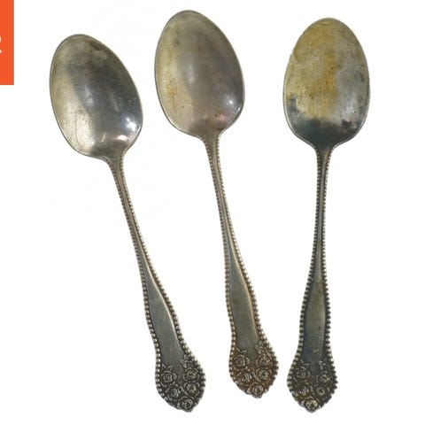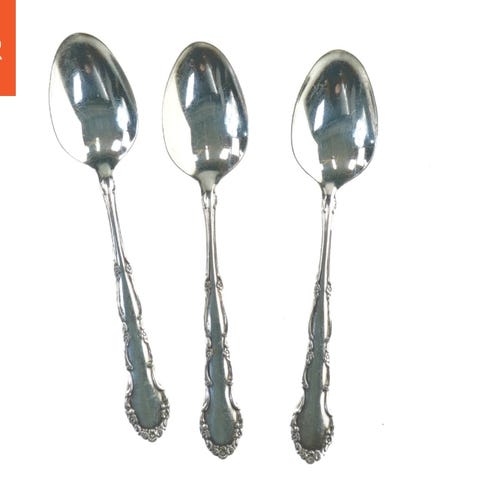 Dette er et sæt af seks dekorative teskeer lavet af metal. De har et design med mønstrede skafter og en glat skehovede. Disse skeer måler 11 cm i længden og 2 cm i bredden.