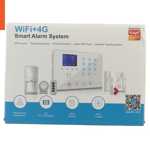 Indbrudssikring alarmsystem, egnet til kommerciel og bolig sikkerhed. Systemet er designet til enkel installation og inkluderer komponenter som alarm kontrolpanel, bevægelsesdetektor, højttaler, strømforsyning, magnetiske kontakter og en nødknap. Fuld udvidelsesmulighed med ekstra komponenter tilgængelige for øget sikkerhed. Pakken leveres med instruktioner for opsætning og brug.