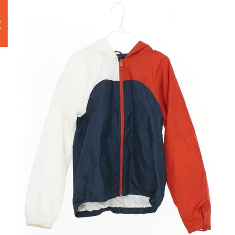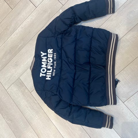 Jakke i mørkeblå farve med lynlås foran. Den har en hætte og to sidelommer. Jakken har mærket Tommy Hilfiger på lynlåsen og et mærke på venstre arm.