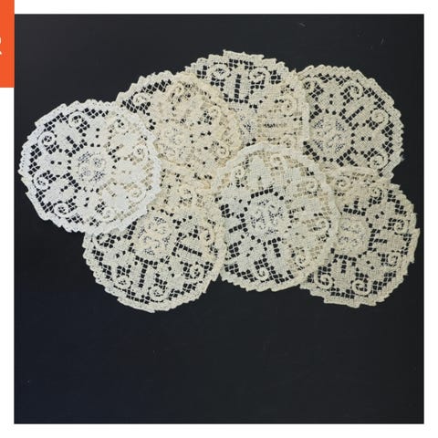 Fire runde tekstiler med en diameter på 16 cm. Tekstilerne har fine broderede blomster motiver og en dekorativ kant. De er hvide med farverige blomsterdetaljer i lilla, lyserød og grøn. Perfekte til dekoration eller som små serveringsduge.