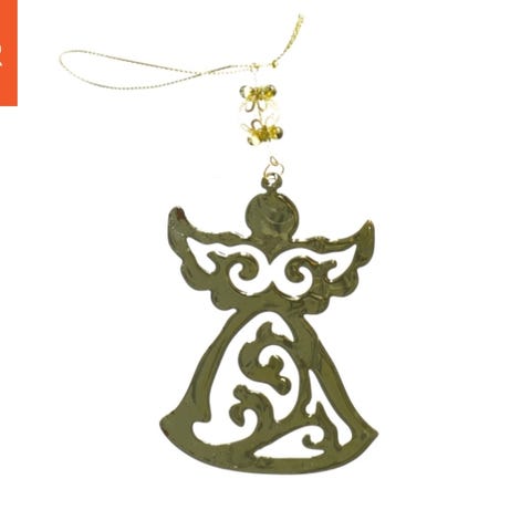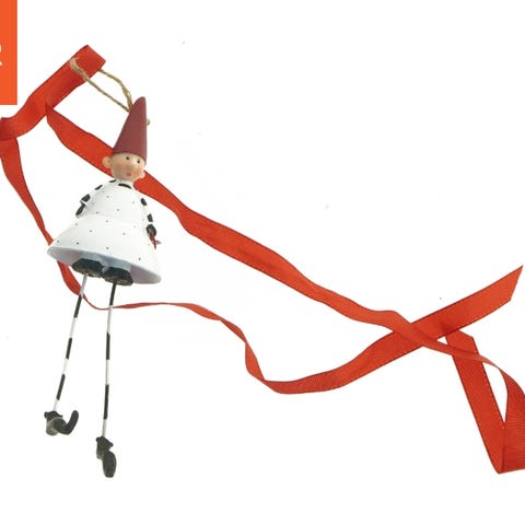 Et brun, cylinderformet juledekoration med påskriften 'Merry X-mas'. Indvendigt er dekorationen foret med aluminium og indeholder en lille LED-lyskæde, der drives af et batteri i en plastikkasse. Objektets dimensioner er 12,5 cm i højden og 9 cm i diameter.