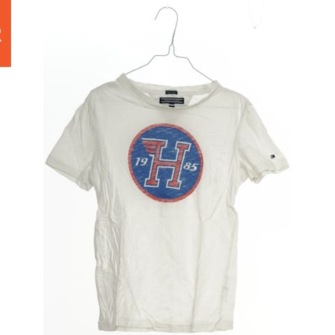 En hvid T-shirt med korte ærmer. Foran er der en grafisk detalje med årstallet 1985 og et diagonalt bånd i farverne rød, hvid og sort, samt mærket 'Hilfiger'. Der er en lille logo på det ene ærme. Bagsiden er ensfarvet hvid med en lille åbning ved halsen med en bånddetalje i de samme farver.