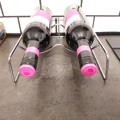 En metal vinreol til max 6 flasker skabt af mærket Menu. Det har en skinnende, reflekterende overflade og er formet med bredere kanter på hver side. Dimensionerne er 9x28 cm.