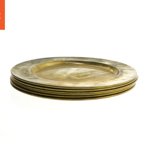 Messing tallerken med en diameter på 17,5 cm. Tallerken har en slidt finish, typisk for messing, med både grønne og brune farvetoner, som skyldes patinering. En stilfuld tilføjelse til borddækning eller dekoration.