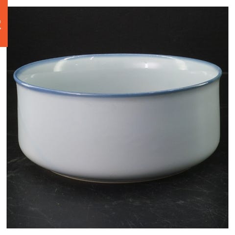 Dette er en rund keramikskål med en diameter på 28,5 cm. Skålen er dekoreret med en brun ringmønstret kant og har et indgraveret hvalmotiv i midten. Bunden af skålen har grønne fødder for at beskytte overflader, den placeres på. Skålen har en rustik æstetik og er sandsynligvis håndlavet.