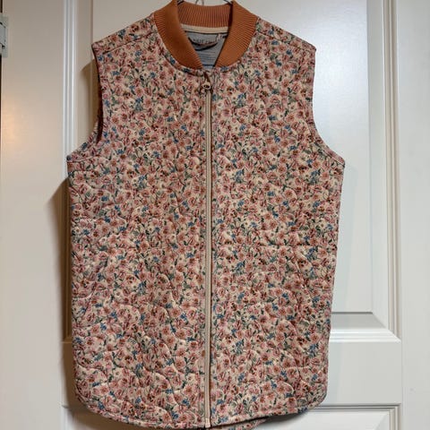En beige vest til børn med fire knapper på forsiden og to lommer under. Vesten er enkel i designet og mærket Wheat angivet på etiketten. Den er fremstillet af let materiale, egnet til barn i alderen 2 år.