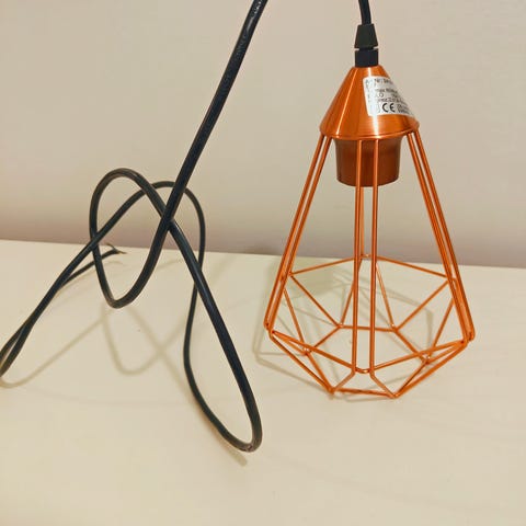 Dette er en kobber pendel lampe designet som en burform fra Bloomingville. Lampen er cirka 12 cm høj og har et moderne geometrisk design med stilfulde linjer. Det medfølgende kabel indikerer, at den er beregnet til ophæng, hvilket gør den velegnet som dekorativ belysning i hjemmet.