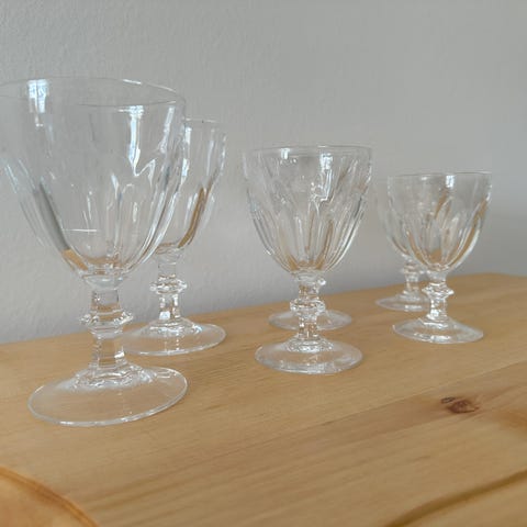 Dette er et sæt af 6 plast vinglas, hver med en kapacitet på 20 cl. Glassene er pakket i tre kasser, hver indeholdende 2 glas. Vinglassene har en elegant, facetteret design, ideelt til servering af diverse vine. De leveres i originale emballage med enkle illustrationer af glassene på forsiden og siden af kasserne.