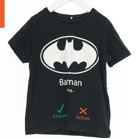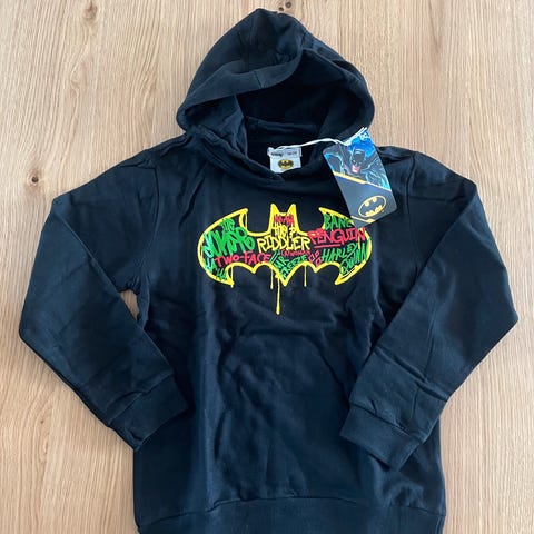 Sort sweatshirt med Batman-logo på forsiden. Sweatshirten har lange ærmer og en rund halsudskæring. Der er ingen synlige størrelsesangivelser i billederne.