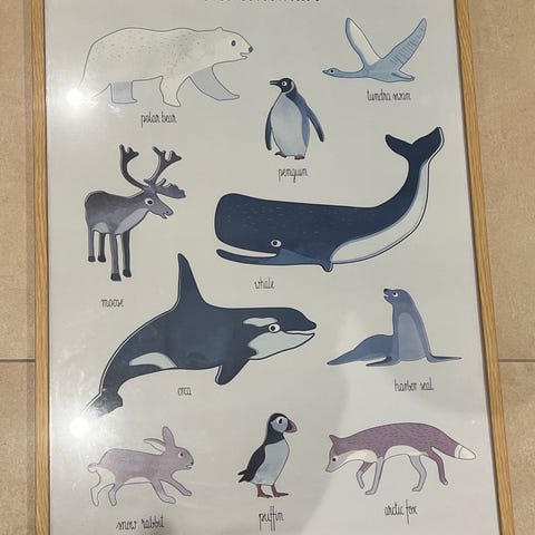 Dyreplakat til børneværelset, størrelse 50x70. Ramme i lyst træ medfølger.