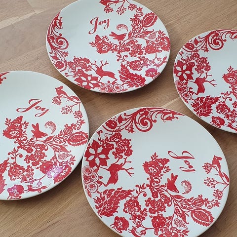 Dette sæt består af flere middagstallerkener med en diameter på 26 cm. Tallerkenerne har et juletema med forskellige farverige motiver, herunder de tre vise mænd og julefigurer som rensdyr og juleslæde. Tallerkenerne er primært hvide med gyldne, blå, og røde detaljer, og de har en gylden kant.