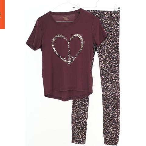 Sæt med kortærmet t-shirt og 3/4 leggings/knickers. T-shirten er hovedsageligt gul med et bladmotiv i sort og gul. Leggingsene er sorte med et tilsvarende bladmotiv placeret nederst på benene i gul farve. Sødt sommersæt.