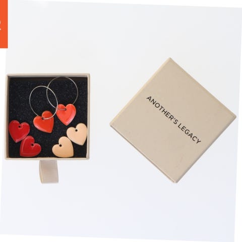 Disse er øreringe, der kommer i en gaveæske. Øreringene har en diameter på 4,5 cm og er designet med cirkulære former i blå og orange nuancer. De er lavet med metal og plastmaterialer og har klassiske låsemekanismer til at sikre dem. Gaveæsken er firkantet og har et gråt design med to sorte diagonale striber.