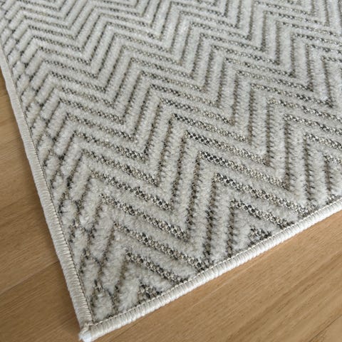Dette er et rektangulært tæppe med dimensionerne 200x50 cm. Tæppet har en struktureret tekstur med en primært grå farvetone. Kanter er indrammet med en matchende kantning, hvilket giver det et rent og elegant udseende. Bagsiden af tæppet er i en blå nuance, hvilket kan give ekstra hold og stabilitet, når det placeres på gulvet.