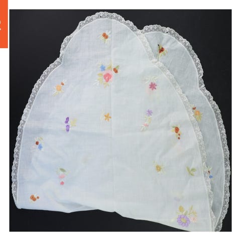 En oval bordløber med dimensionerne 27x21 cm. Bordløberen har et hvidt stof med et blåt broderet mønster, der viser krøllede linjer. Kanterne har en bølget form og er også kantet i blåt. Dette stykke er velegnet som en dekorativ tilføjelse til borde eller andre overflader i hjemmet.