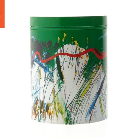 En rund metalbeholder med et farverigt design, måler Ø. 11 cm og længden 15 cm. Den har et kunstnerisk udseende med blandede farver som rød, grøn og blå, og er dekoreret med krusseduller. Beholderen ser ud til at være en del af en begrænset kunstudgave, som nævnt på bagsiden, med Jean Messagier som kunstner. Dåsens låg er aftageligt, og indersiden er i en naturlig metalfinish.