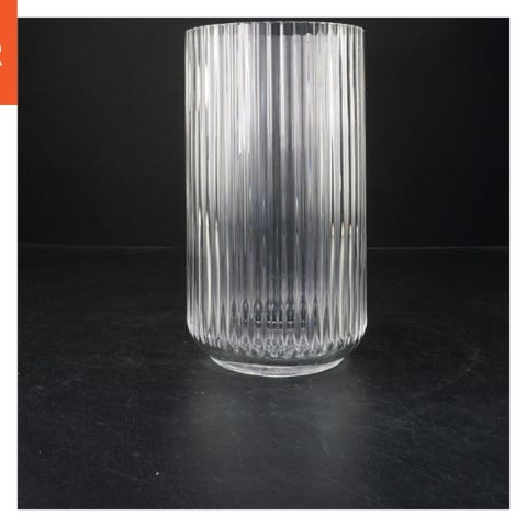 Denne vase er lavet af gennemsigtigt glas og har en riflet overflade. Den er cylindrisk i formen og måler 20 cm i højden. Vasen er egnet til dekorativ brug, fx til placering af blomster. Den har en robust base, som sikrer stabilitet på forskellige overflader.