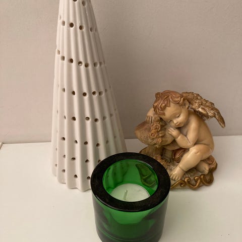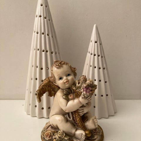 Denne er en dekorativ figur, der viser en engel og et par, der sidder omkring krybben med en baby. Figuren er lavet af resin eller lignende materiale og har en højde på 14 cm. Den er malet i gyldne og jordnære farver og står på en brun base.