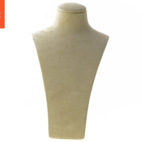 Fritstående halskædestativ i beige stof, designet til at fremvise smykker. Passer til udstilling af halssmykker og er praktisk til både butiksbrug og hjemmebrug. Stativet er 32 cm høj.