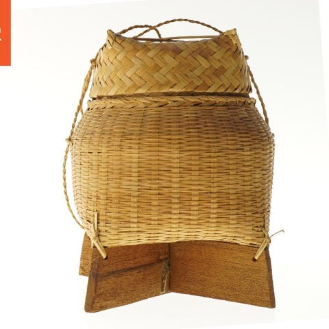 Dette er en vintage japansk lakvarekurv, muligvis fra 1920'erne, fremstillet af flettet bambus og træ, belagt med sort lak og dekoreret med gulddetaljer.