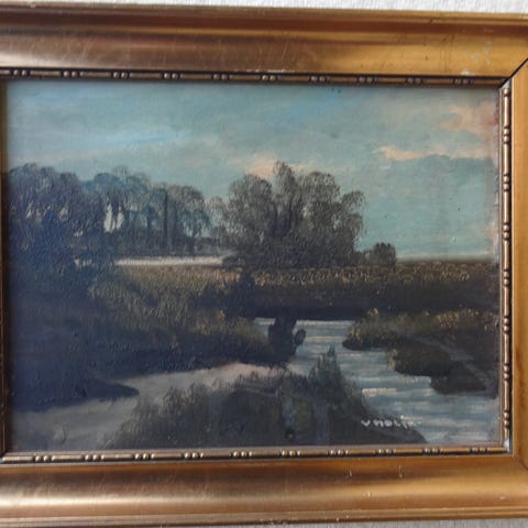 Maleri af V. Holm med motiv af et landskab, der inkluderer træer, en bro og vand. Maleriet er udført i olie på lærred og indrammet i en dekorativ ramme.