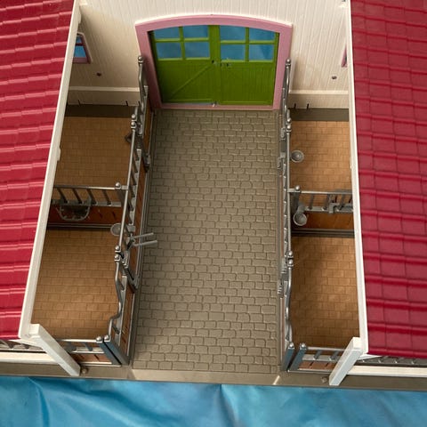 Schleich ridehal og saddelrum med udstyr, mennesker og heste. Står som nyt, da det blot er samlet, men aldrig leget med.