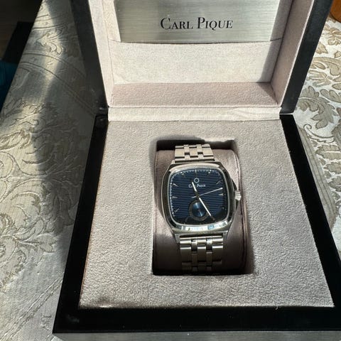 Carl Pique Pacific CP0011 har en rund urkasse med en karakteristisk bezel, der tilføjer dybde til designet. Urskiven er blå og viser et enkelt layout med tre kronografer og markante timemarkører for nem aflæsning. Urviserne skiller sig ud mod skiven og giver et klart billede af tiden. Urkassen er lavet af 316L kirurgisk stål, hvilket giver holdbarhed, mens safirglas sikrer ridsefasthed.