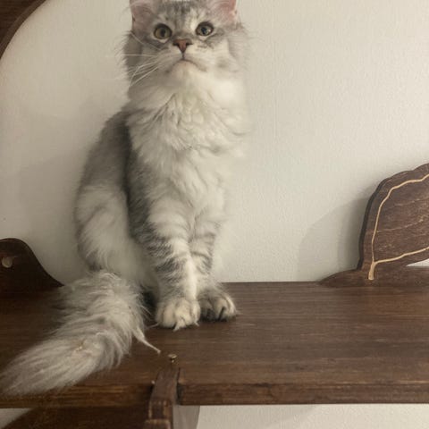 Hun sælges fordi hun er meget bange for hænderne og har altid været det fra jeg købte hende. Hun er ikke bange for andre dyr, og kan fint med andre katte.