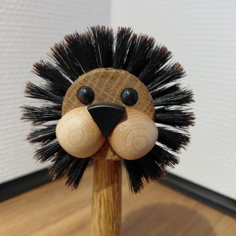 Den er laver i eg og kinderne er af ahorn, manken er lavet af børster.