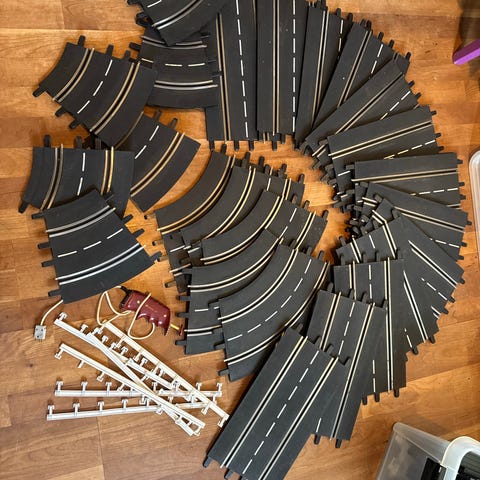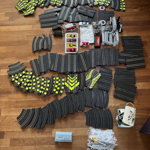 Ældre racerbane af mærket fleischmann med mange skinner og biler.