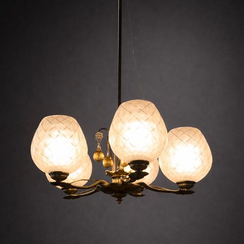 Smuk og markant lysekrone udført i kraftigt metal, formentlig støbejern kombineret med bruneret messing. Lysekronen er udstyret med seks originale opalglas-kupler, som giver et blødt, behageligt og stemningsfuldt lys.