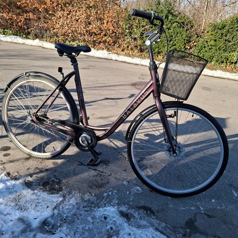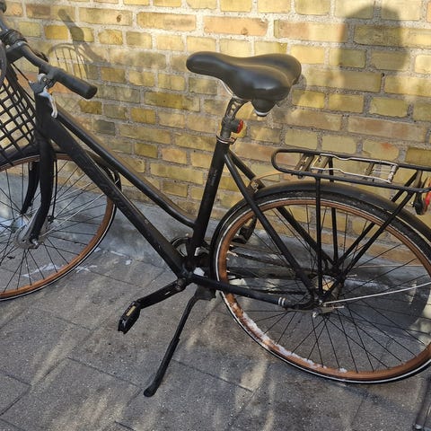 Har denne pæne cykel i bronzefarve til salg med gode punterhæmmene dæk rustfri kæde godkendt lås med 2 nøgler fastmonterede lygter forlygte er( navlygte dynamo inde i forhjul ) baglygte med batterier, forbremse er håndbremse som er en rullebremse og bagbremse fodbremse justerbar frempin klikkurv en fastmonterede aftagelig kurv som vandafvisende og til at bruge som indkøbskurv og klapsamlig den er gået efter har fået