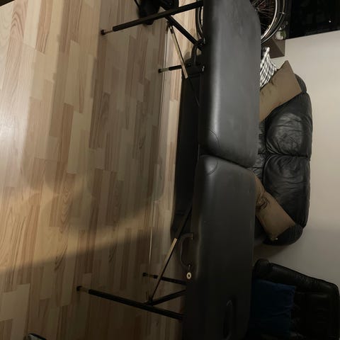 Altermed massagebænk med træramme, sort polstring, justerbar højde og aftagelig hovedstøtte. Bænken er foldbar for nem transport og opbevaring.