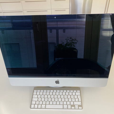 Apple iMac med 21.5-tommer skærm. Computer med Intel Core i5 processor og macOS Monterey operativsystem. Designet til almindelig brug og multimedieopgaver.