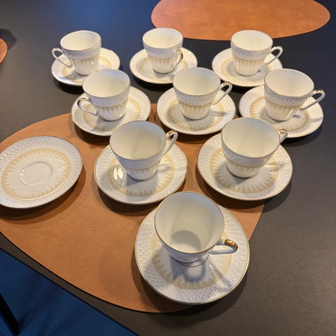 Marselisborg Edelstein spisestel. Hvid porcelæn med guldkant. Brugt men stadig flot