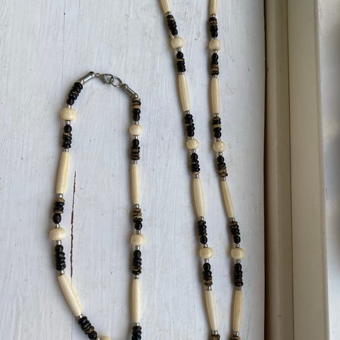 Kæden med små hvide stenbrud er 56, 5 cm lang.