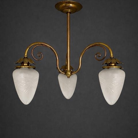 Herskabelig vintage lysekrone i messing med fire originale glasskærme i matteret, mønstret glas.